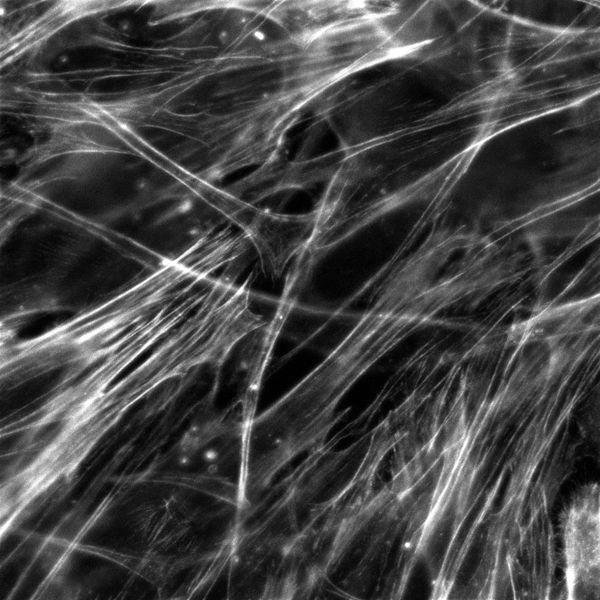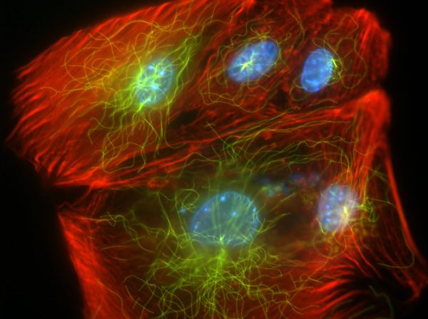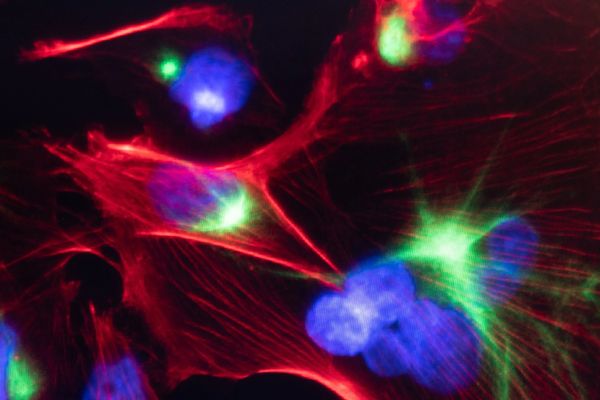 Stromal cells stained for actin (red), microtubules (green) and nucleus (blue)