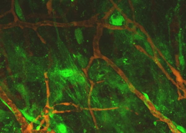 Tumor blood vessels perfused with red dye in the brain of GFP positive bone marrow transplant mouse