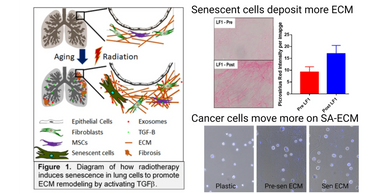 Age and radiation induced senescence increase TGF-beta expression to promote ECM remodeling and lung fibrosis. Projects use multiphoton imaging to characterize changes in the ECM at multiple length scales.