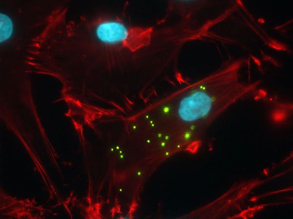 Human mesenchymal stem cells injected with 200 nm polystyrene nanoparticles (green) stained for actin (red) and nuclei (blue)